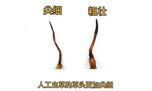 第一,人工蟲(chóng)草的草頭更加纖細(xì)。