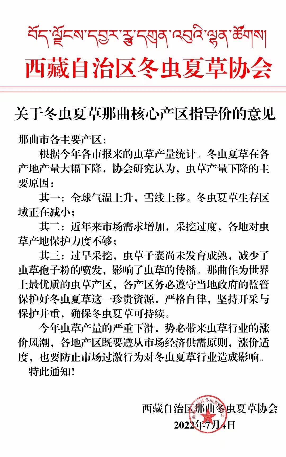 那曲作為世界上最優(yōu)質(zhì)的蟲草產(chǎn)區(qū),各產(chǎn)區(qū)務(wù)必遵守當(dāng)?shù)卣谋O(jiān)管保護(hù)好冬蟲夏草這一珍貴資源,嚴(yán)格自律,堅(jiān)持開采與保護(hù)并重,確保冬蟲夏草可持續(xù)。今年蟲草產(chǎn)量的嚴(yán)貢下滑,勢必帶來蟲草行業(yè)的漲價風(fēng)潮,各地產(chǎn)區(qū)既要遵從市場經(jīng)濟(jì)供需原則,漲價適度,也要防止市場過激行為對冬蟲夏草行業(yè)造成影響。特此通知!