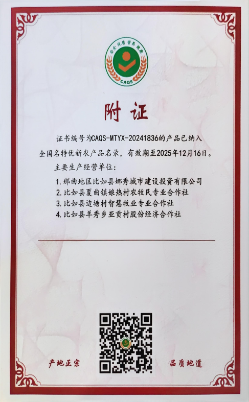 近日,農(nóng)業(yè)農(nóng)村部農(nóng)產(chǎn)品質(zhì)量安全中心正式發(fā)布“2024年第三批全國名特優(yōu)新農(nóng)產(chǎn)品名錄”。其中,由比如縣申報(bào)的“比如亞貢牦牛”成功入選該名錄!這標(biāo)志著比如縣在深入推進(jìn)“智慧牧業(yè)”建設(shè)、促進(jìn)高原特色現(xiàn)代牧業(yè)高質(zhì)量發(fā)展方面取得了又一重要成果。
