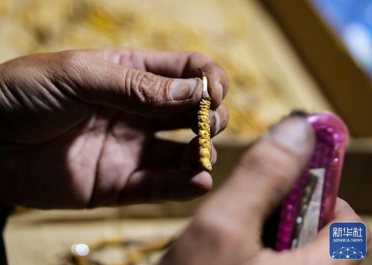 傍晚回到采集點(diǎn)營地后,牧民在用毛刷清理蟲草上的土(5月25日攝)。